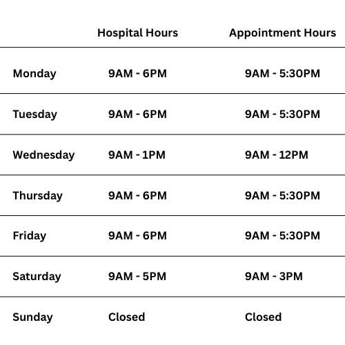 Feel free to contact us during our hospital hours if you would like to schedule an appointment.